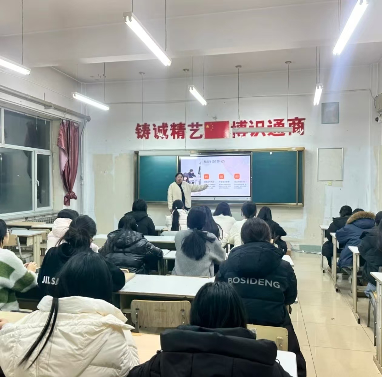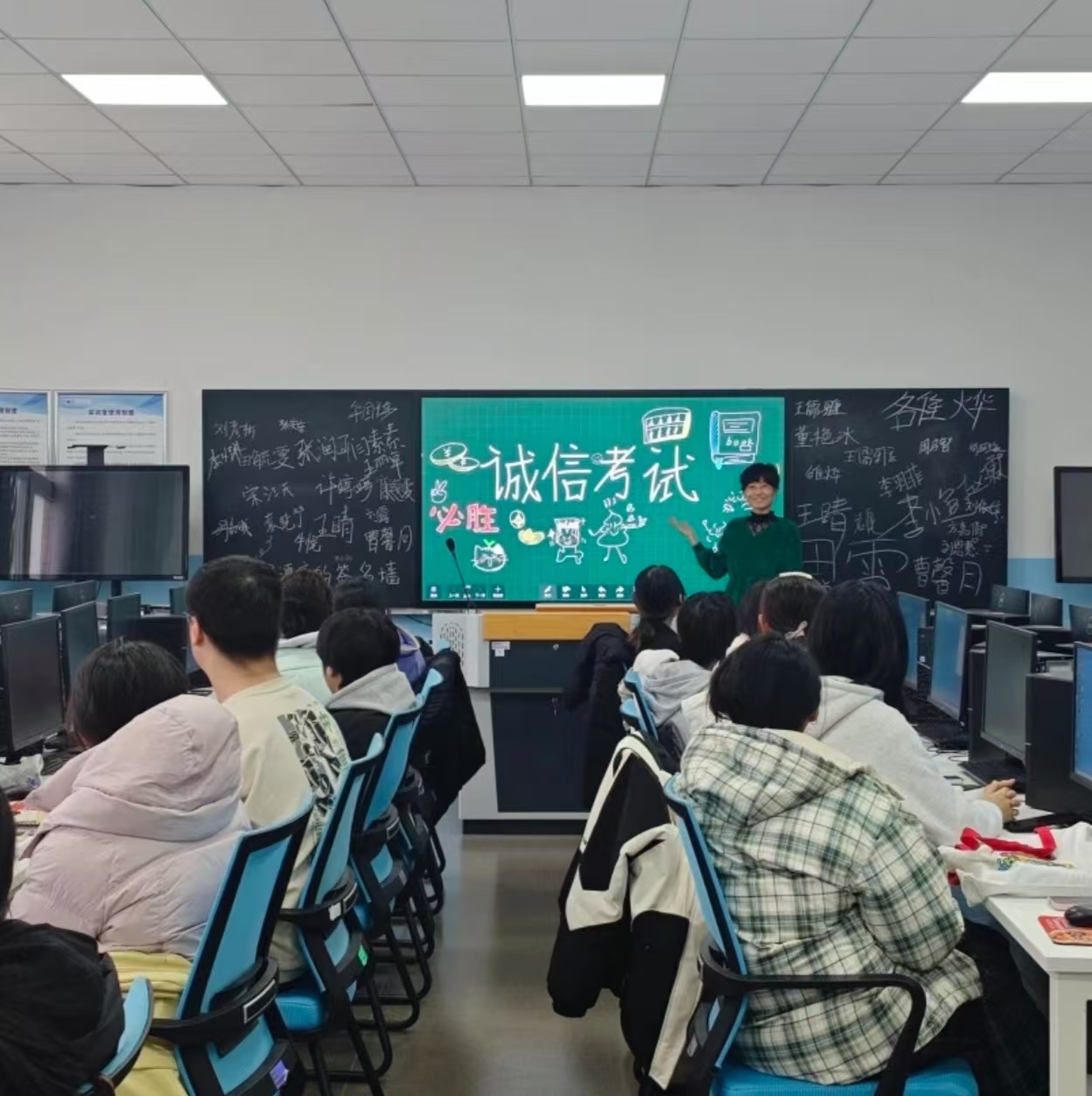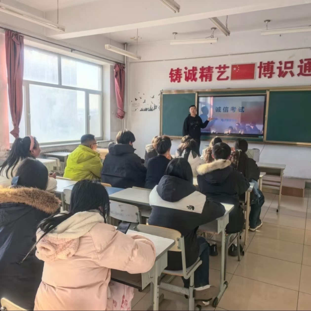 各班召开专题班会,向学生详细解读替考、协助作弊等行为的法律后果与纪律处分——替考舞弊不仅会被取消考试成绩、记入个人诚信档案,情节严重者还将面临刑事处罚。同时,通过真实案例分析替考舞弊对个人学业、职业发展的恶劣影响,让学生深刻认识到替考舞弊的危害性,自觉摒弃侥幸心理。